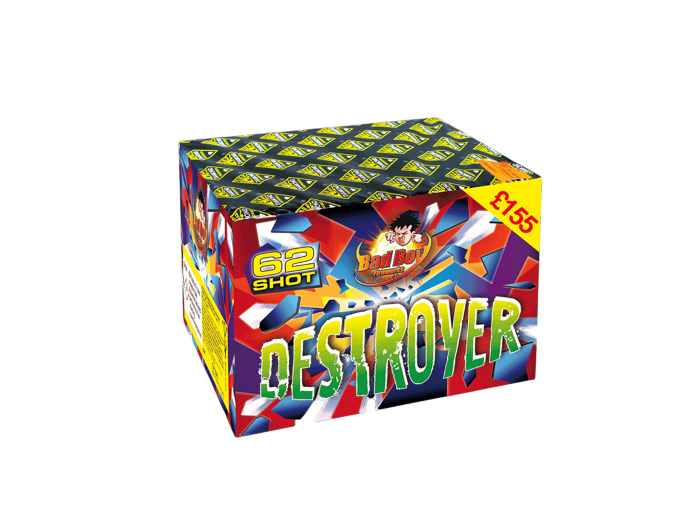 The Bad Boy Destroyer does exactly what it says on the tin! Ignite the fuse and stand back as it fires 62 massive shots into the night sky with big enough bursts, reports and effects to destroy anything in their path! Part of the new 1.3G range, your guaranteed bigger, louder and brighter than ever before!